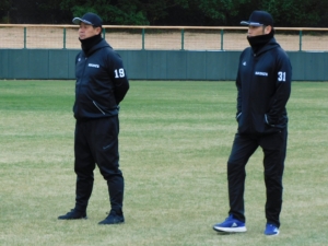 赤堀監督(左)と練習を見守る中村コーチ