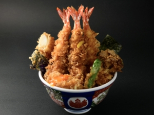創業時には、秘伝の丼たれに最も合う食材を求めて何度も試行錯誤したという。その結果たどり着いたのが、朝に市場(現在は豊洲)で仕入れる新鮮な穴子、エビ、イカ、半熟玉子、野菜を組み合わせた豪快な江戸前天丼。見た目の迫力だけでなく、最後まで温かく食べられるよう、丼には底に空洞を施した保温効果の高い有田焼の特注品を採用するこだわりも持つ。